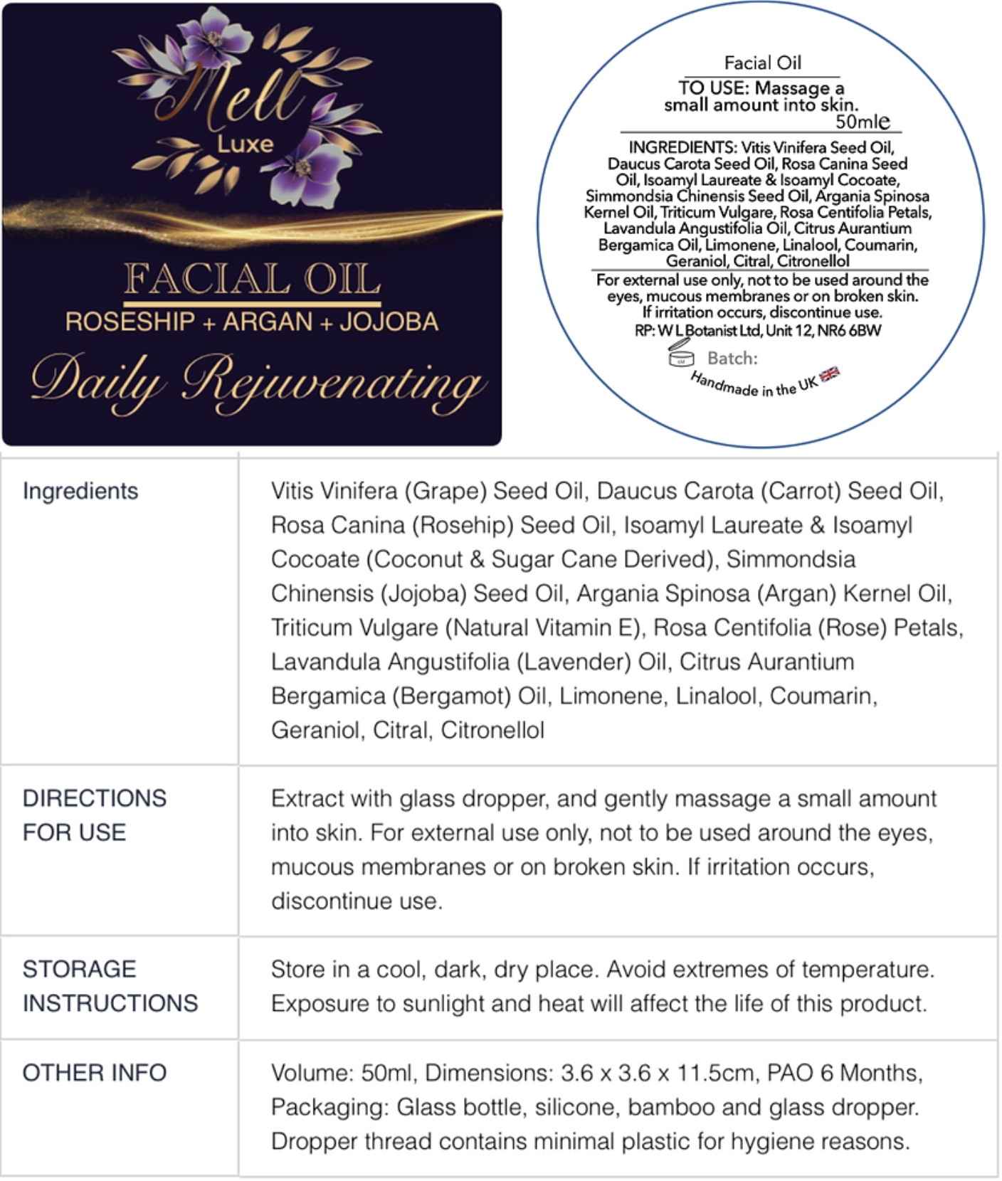 Featuring Rosehip, Argan, Carrot Seed, Jojoba, and Grapeseed oils, this formulation is designed to provide the best care for your skin with anti-ageing, anti-inflammatory, and antioxidant benefits. Unlike mainstream products filled with fillers, our facial oil is rich with only the finest plant extracts.